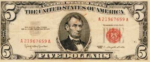 Eén van Kennedy’s 5 dollarbiljetten (met eerbetoon aan Lincoln). Zie het opschrift bovenaan: United States Note